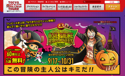 ワンピースのキャラクターになりきって楽しむ「ワンピース ハロウィン2016」「ONE PEACE」のアトラクションテーマパーク、「東京ワンピースタワー」では、9月17日~10月31日の期間、シーズン限定イベント「ワンピース ハロウィン2016」を開催する。