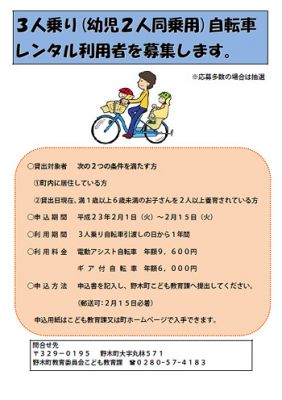 栃木県野木町は2011年1月27日、子育て家庭に対する支援と、親子の安全を守るため、3人乗り自転車の貸出を行うと発表した。