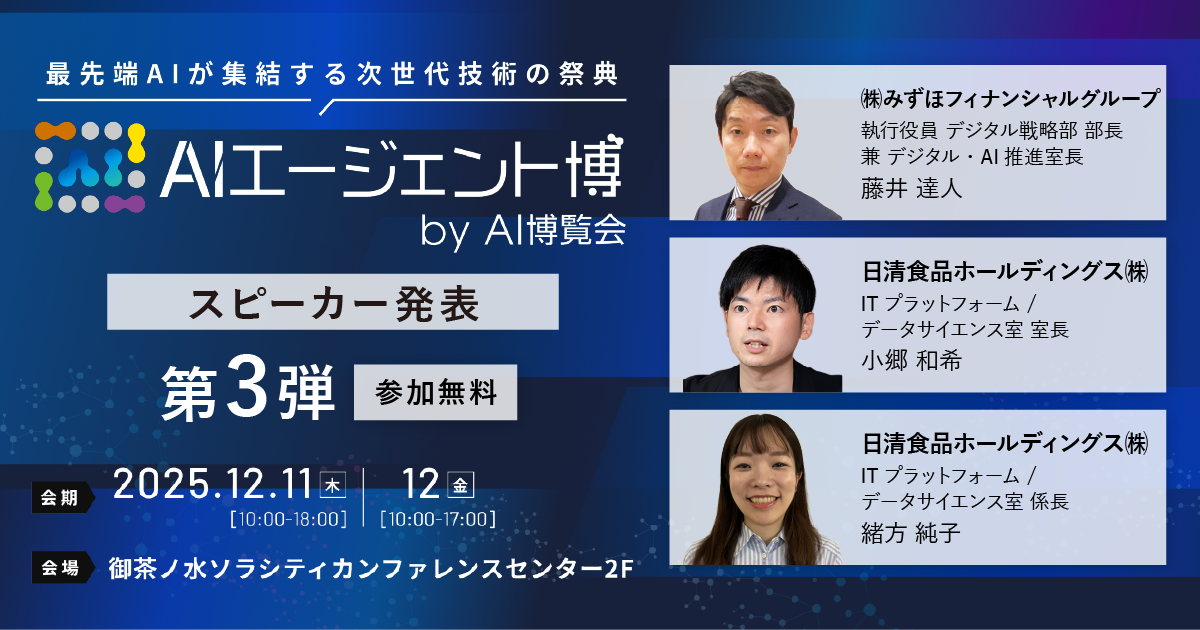 【AIエージェント博】第3弾スピーカー3名を発表!金融の「ビジネス変革」と食品の「次世代分析」。トップ企業が語るAI活用!